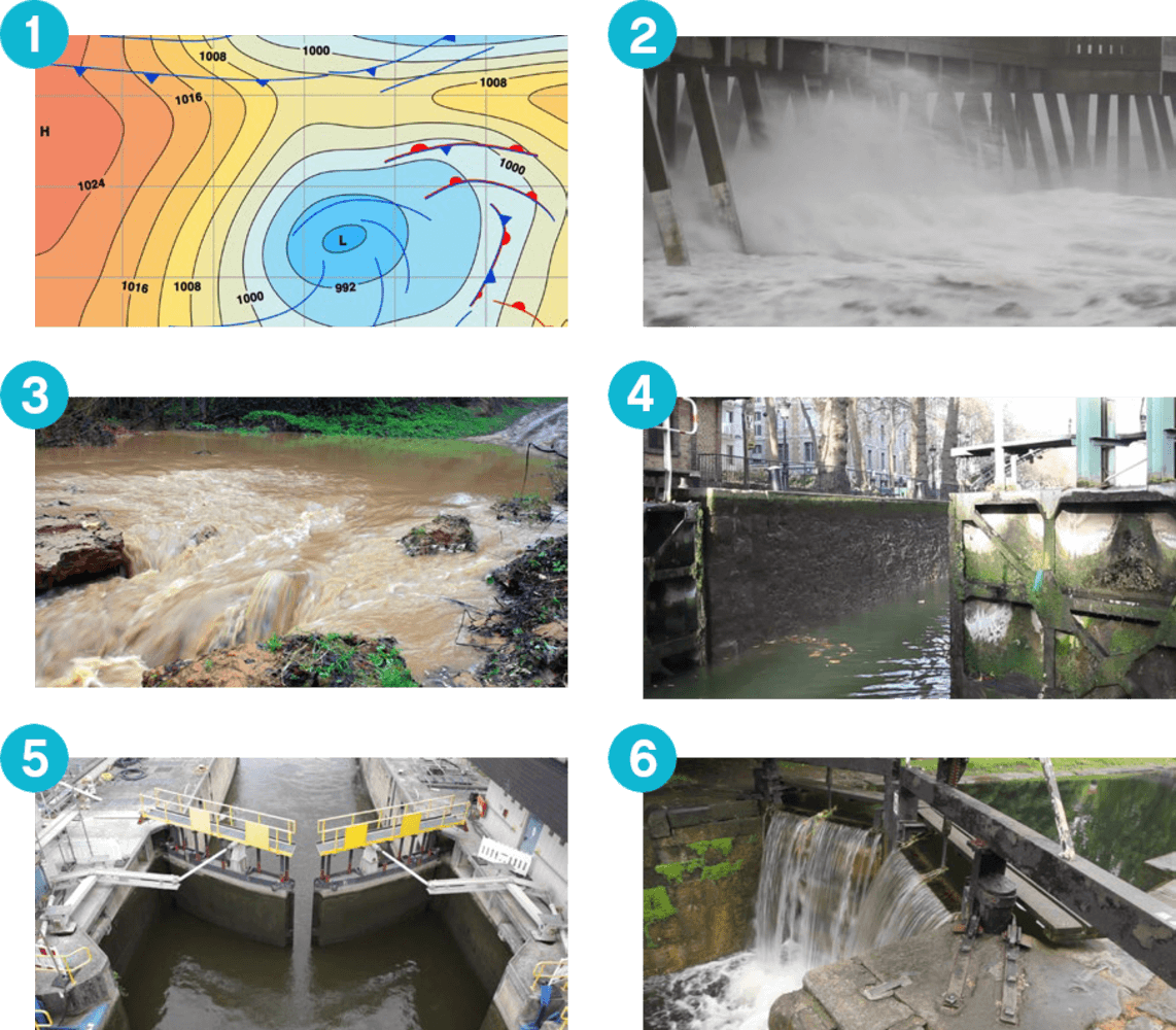 - Cuando hay precipitaciones regulares, las compuertas están abiertas para mantener el nivel del depósito bajo.