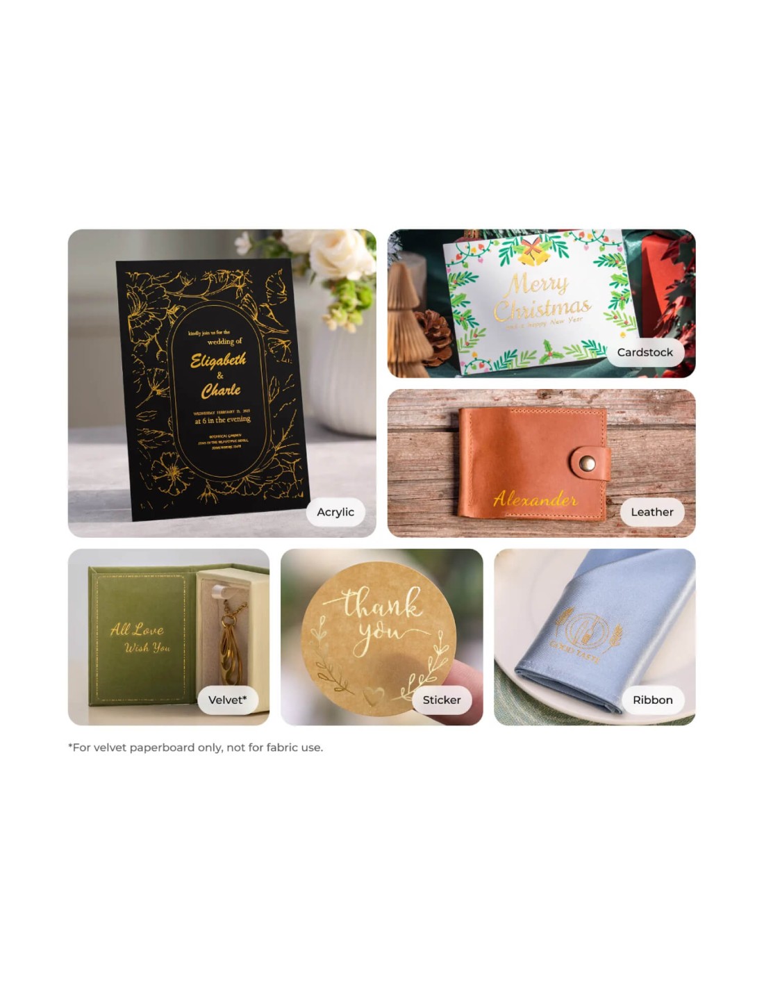 Es compatible con una amplia variedad de materiales, como papel, cartulina, cartón, papel vegetal, cuero sintético, acrílico y madera. Además, puede trabajar con materiales de hasta 21 mm de grosor y hasta 139 mm con una base elevadora, lo que lo hace ideal para personalizar objetos tridimensionales como cajas de regalo.