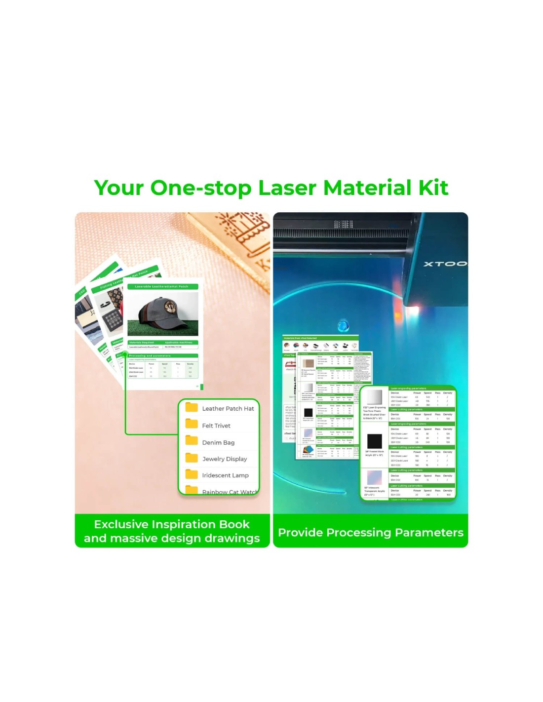 El kit de materiales xTool Ultimate es perfecto tanto para principiantes como para usuarios avanzados que buscan explorar la amplitud de las capacidades de la tecnología de corte y grabado láser. Con este kit, los usuarios pueden experimentar con una amplia gama de materiales, texturas y efectos, desarrollando proyectos innovadores y de alta calidad.