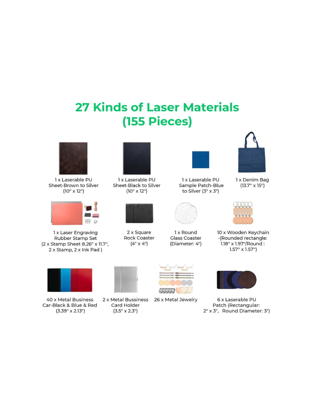 Los materiales incluidos han sido seleccionados meticulosamente para asegurar una interacción perfecta con el láser, lo que garantiza cortes y grabados nítidos y precisos. La madera es ideal para crear objetos decorativos, regalos personalizados y proyectos de bricolaje, mientras que el acrílico permite lograr acabados brillantes y detallados, perfectos para piezas promocionales o accesorios de alta gama. El cuero es perfecto para crear productos de lujo como carteras, cinturones y otros accesorios personalizados.