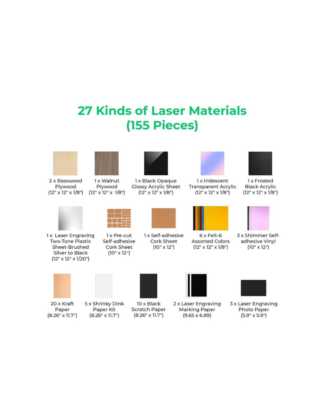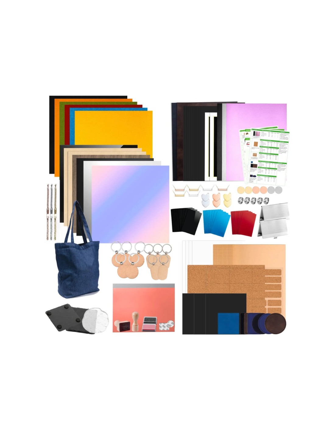 Incluye una variedad de materiales como madera, acrílico, cuero, cartón, tela, y más, ideales para realizar proyectos de corte y grabado de alta precisión y calidad profesional.